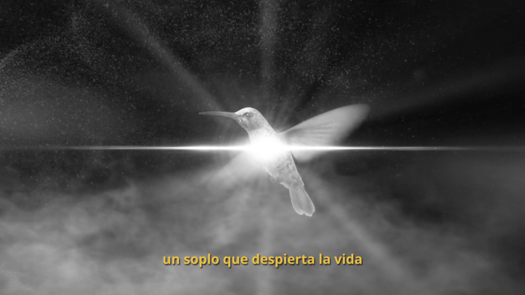 El colibrí aparece así como mensajero entre dimensiones, un ser que participa del origen mismo del cosmos.
